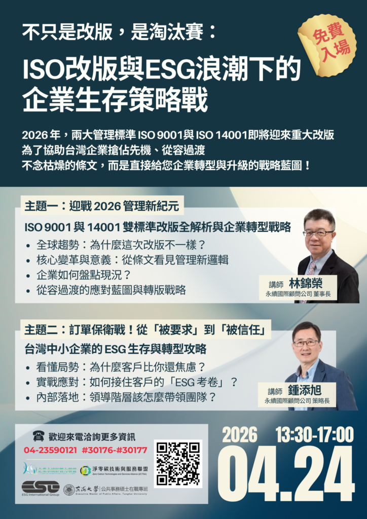 主題一:迎戰 2026 管理新紀元—ISO 9001 與 14001 雙標準改版全解析與企業轉型戰略