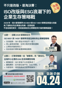 活動資訊 【免費論壇】不只是改版,是淘汰賽:ISO改版與ESG浪潮下的企業生存策略戰 24 3 月, 2026 尚無留言 2026 年,企業界最核心的兩大管理標準 ISO Read More » 【免費講座】資源有限的ESG突圍術:中小企業永續管理師特訓營 18 3 月, 2026 尚無留言 破除名詞迷霧、搞定跨部協調與顧問對接的實戰 7 小 Read More » 課程到底該怎麼選❓永續課程超好懂懶人包💡 16 3 月, 2026 尚無留言 課程到底該怎麼選??想充實自己、快速拿永續證照,卻 Read More » ✨2026年永續碳管理系列課程總覽✨ 16 3 月, 2026 尚無留言 【東海大學永續碳管理系列課程─淨零策略暨碳管理師培 Read More » 💥ISO 14064-1 & ISO 14067 證照課程強勢來襲💥 9 3 月, 2026 尚無留言 【東海大學永續碳管理系列課程─淨零策略暨碳管理師培 Read More » ⚡2026年度 ISO 50001能源管理系統課程⚡ 6 3 月, 2026 尚無留言 【東海大學永續碳管理系列課程─淨零策略暨碳管理師培 Read More » 查看更多文章